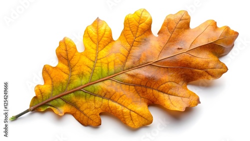 leaf, oak, autumn, fall, foliage, yellow, orange, brown, green, nature, botany, plant, flora, detail, macro, closeup, isolated, white, background, single, texture, vein, colours, vibrant, seasonal, crisp, sharp, photo, image, autumn, deciduous, biology, leafage, stem, organic, natural, element, design, illustration, botanical