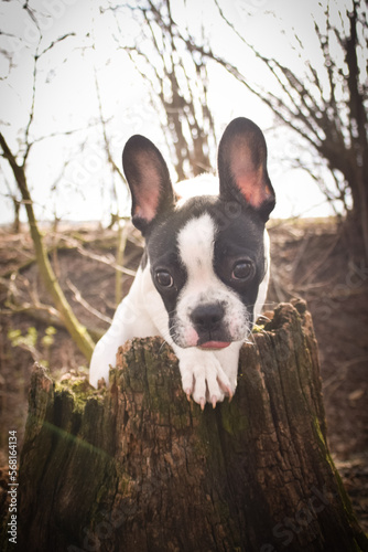 Autumn portrait of puppy of french bulldog on field. He is so cute in with this face. He has so lovely face.