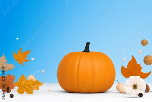 Autumn Pumpkin Harvest Scene - A single orange pumpkin sits on a white surface against a light blue background, surrounded by falling autumn leaves and other seasonal elements.
