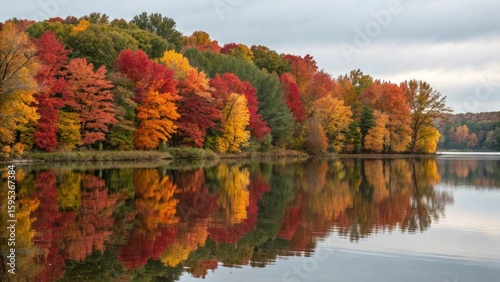 Autumn Reflections: A vibrant display of autumn foliage, with trees painted in fiery hues of red, orange, and yellow, reflected beautifully in the calm waters of a lake.