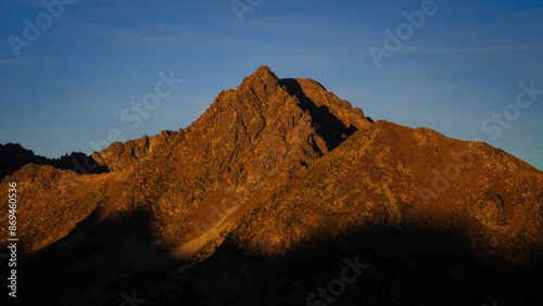 Autumn sunrise at Pic Alt de Cubil peak, seen from Port d'Envalira mountain pass (Andorra, Pyrenees)