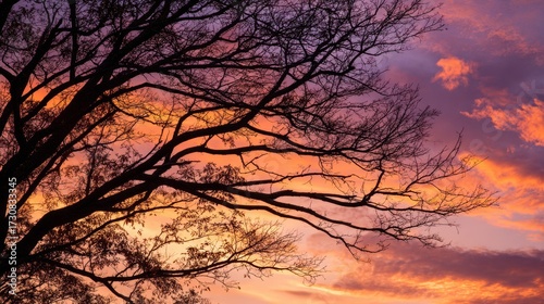 Autumn tree branches silhouetted against warm sunset sky