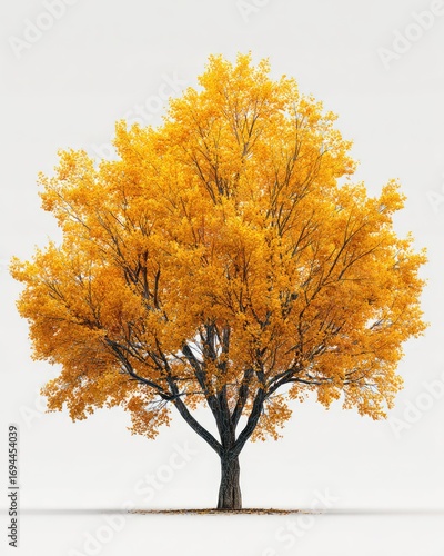 autumn, tree, yellow, foliage, branch, leaf, nature, fall, gold, orange, brilliant, vibrant, isolated, single, deciduous, standing, full, dense, branchy, canopy, mature, healthy, growth, strong, trunk, stem, root, image, graphic, autumn, season, colourful, bright, light, white, background, digital, three-dimensional, rendering, model, plant, forest, landscape, design, view