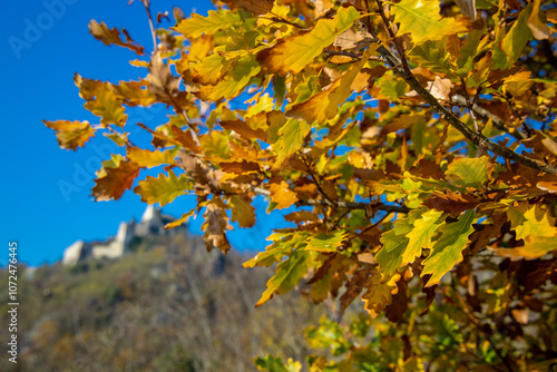Autumn yellow leaves on the tree. Orange and yellow colour of the autumn season on a sunny day