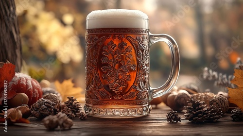 Autumnal Beer Mug on Wooden Table with Pinecones and Pumpkins