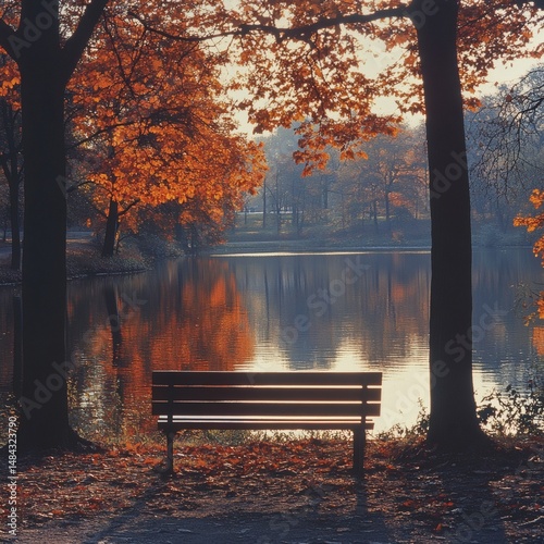 Autumnal Bench by Tranquil Lake Scene