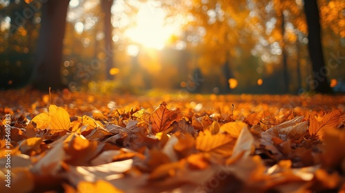 leaf, autumn, fall, forest, nature, gold, sunlight, sunset, tree, ground, orange, yellow, brown, park, timberland, season, october, november, september, landscape, scenery, background, photo, image, picture, photo, fall foliage, autumn leaf, golden hour, warm, cosy, peaceful, serene, tranquil, calm, relaxing, beautiful, vibrant, natural