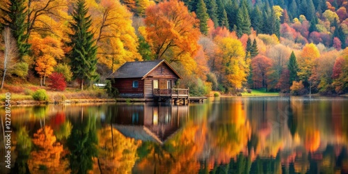 autumnal cottage by serene lake scene, cozy retreat, natural beauty