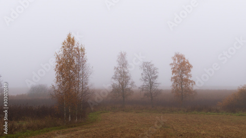 tree, landscape, autumn, nature, sky, tree, forest, meadow, grass, birch, blue, field, fog, cloud, season, spring, mist, fall, green, park, yellow, wood, outdoors, sun, morning