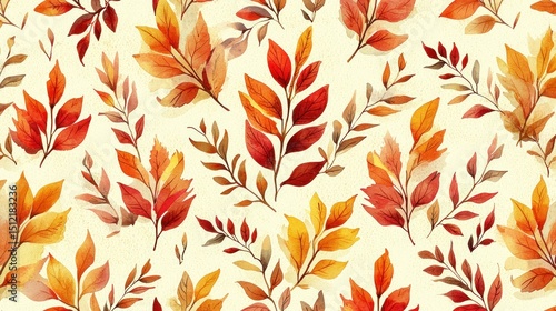 autumn, fall, leaf, foliage, branch, orange, red, yellow, pattern, seamless, design, watercolor, floral, nature, illustration, background, texture, decorative, ornamental, art, graphic, vintage, warm, vibrant, colours, detailed, repeating, botanical, natural, organic, warmth, seasonal, artistic, patterned, poster, wallpaper