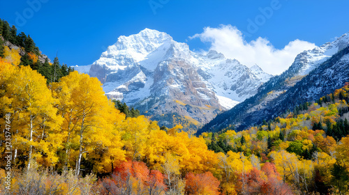 Autumnal mountain landscape snow-capped peaks, golden aspen trees