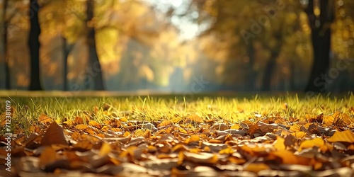 Autumnal nature with colorful trees and fallen leaves in forest park seasonal fall creating beauty in landscape bright maple leaf on ground sunny day outdoors flora and environment closeup view