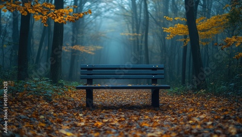 Autumnal park bench path, misty forest background, solitude, nature scene