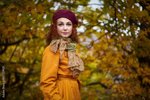 mature, senior, old, season, seasonal, autumn, vibrant, autumn, yellow, fall, leaf, orange, female, woman, nature, forest, sweater, lady, people, person, cute, attractive, adult, portrait, caucasian, candid, environment, high-coloured, colourful, bright