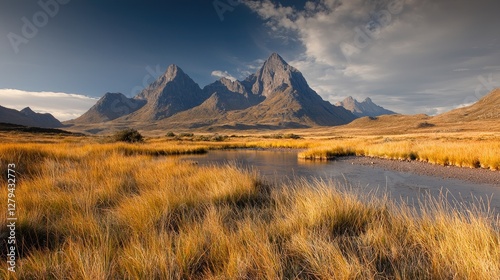Autumnal river flows past golden grasses towards majestic mountains