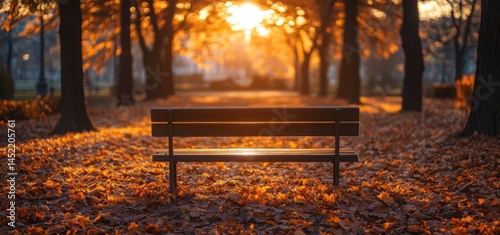 Autumnal Serenity: A park bench bathed in the golden light of sunset, surrounded by fallen leaves.