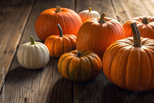 Autumnal Still Life with Orange and White Pumpkins on Rustic Wood Surface Top Lit