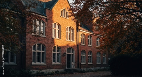 brick, building, sunlight, shadow, autumn, fall, house, historic, exterior, window, door, red, orange, leaf, tree, garden, tranquil, calm, vintage, structure, architectural, detail, facades, urban, old, gabled, classic, symmetry, ornate, cobbled, path, fall foliage, warm, gold, shadow, perspective, european, history, stone, grey, brown, warmth, nature