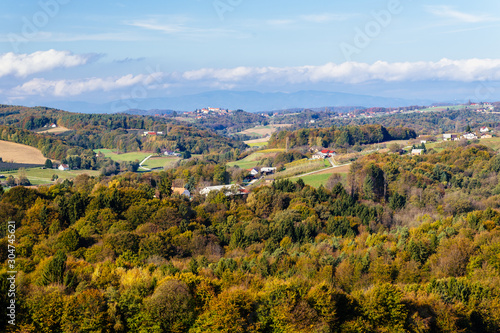 landscape, up high, agronomy, background, blue, countryside, cultivated, environment, farm, farming, field, flying, green, growth, horizon, land, landscape, meadow, nature, plant, purple, road, row, sky, slovenia, tree