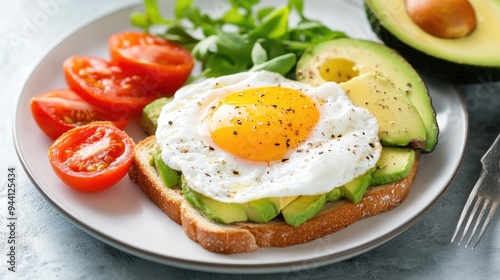 avocado toast with a poached egg and a side of fresh tomatoes, showcasing a balanced breakfast