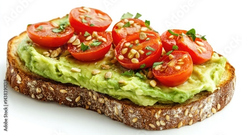 Avocado Toast with Cherry Tomatoes and Fresh Herbs on White Background