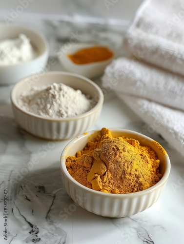 Ayurvedic face pack/mask using Gram flour/besan, haldi ubtan placed in bowls , scrub and white towel on marble table.