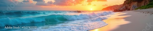 Azure ocean waves crash on white sand beach at sunset, horizon, seascape