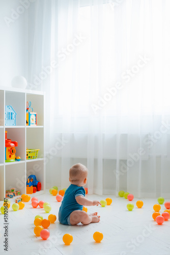 baby 7-9 months to a year old sits on the floor in a cozy white interior nursery with stylish furniture