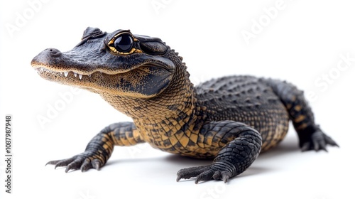alligator, reptile, wildlife, animal, baby, crocodile, nature, scale, photo, closeup, fauna, reptilian, eye, head, mouth, teeth, jaw, skin, tail, leg, claw, body, colours, texture, pattern, green, black, yellow, white, background, studio, isolated, sharp, focused, sharpness, detail, macro, portrait