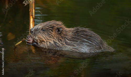 Baby Beaver gnawing on a twig in a river in the united kingdom