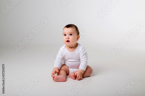baby boy 9 months in a white bodysuit sitting on a white background, space for text