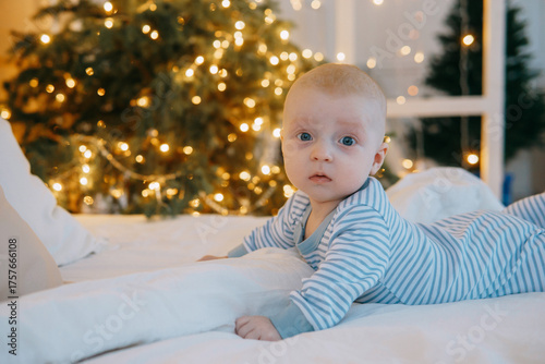 Baby boy in striped pajama on bed with warm blanket at Christmas time. Child laying. Infancy, childhood, family.
