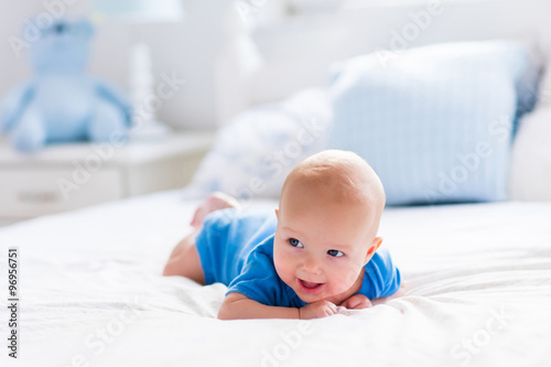 Baby boy in white sunny bedroom