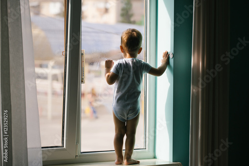 boy, baby, children, children, childhood, cute, little, caucasian, human, indoor, toddler, blond, hair, striped, stay, sill, look, window, home