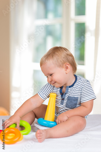 baby boy playing with colorful toy pyramid