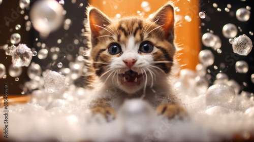 Baby cat taking a bath full of soap foam created with generative AI technology