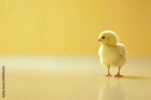 Baby chicken on a yellow background. A monochrome background with a place for text and cute, fluffy yellow pet chickens.