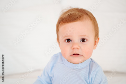 Baby close-up portrait, smiling and joyful little child on a white bed in a blue bodysuit