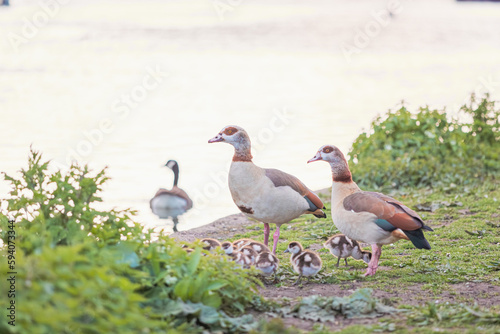 Baby Egyptian goose and family in the riverside, Spring, England