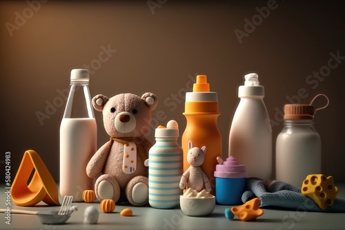 Baby food and milk bottle with kids accessories. AI generation