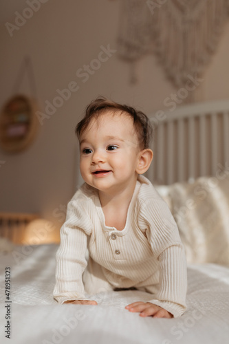 adorable, home, baby, bed, bedchamber, beige, blanket, children, childhood, cosy, crawl, crawling, cute, daughter, home, infant, interior design, morning, movement, newborn, smile, smiling