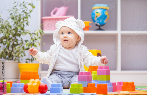 baby girl playing with colourful building blocks at home or kindergarten