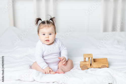 baby girl playing wooden toy typewriter on the bed at home, the concept of play and development of children