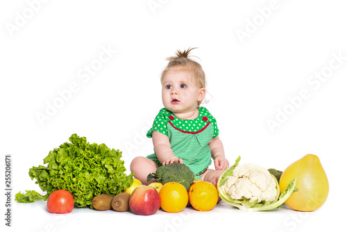 Baby girl sitting surrounded by fruits and vegetables, isolated on white