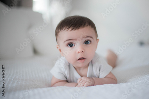 Baby in white bed bed playing looking at he camera serious face tummy time