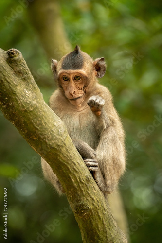 Baby long-tailed macaque sits on green branch
