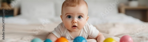 Baby looking curiously at colorful toys while lying on a cozy bed, Infant play, home warmth, discovery