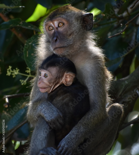 Baby macaque monkey hugging its mother in the jungle