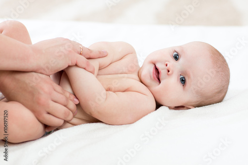 Baby massage. Mother doing gymnastics to kid.