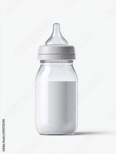 Baby milk feeding bottle with transparent body and silicone nipple isolated on clean background for childcare product advertising, parenting blogs and infant nutrition promotion